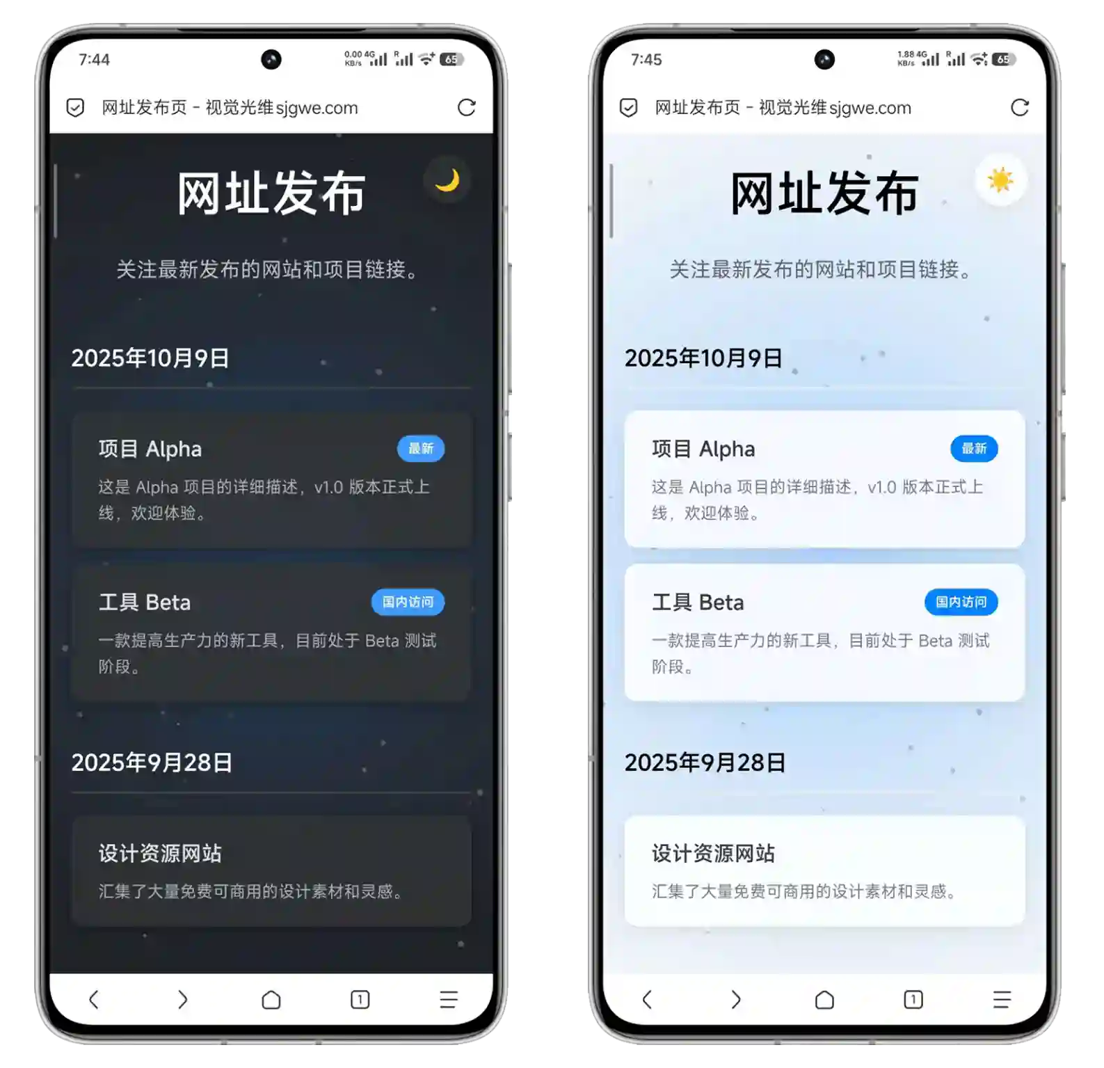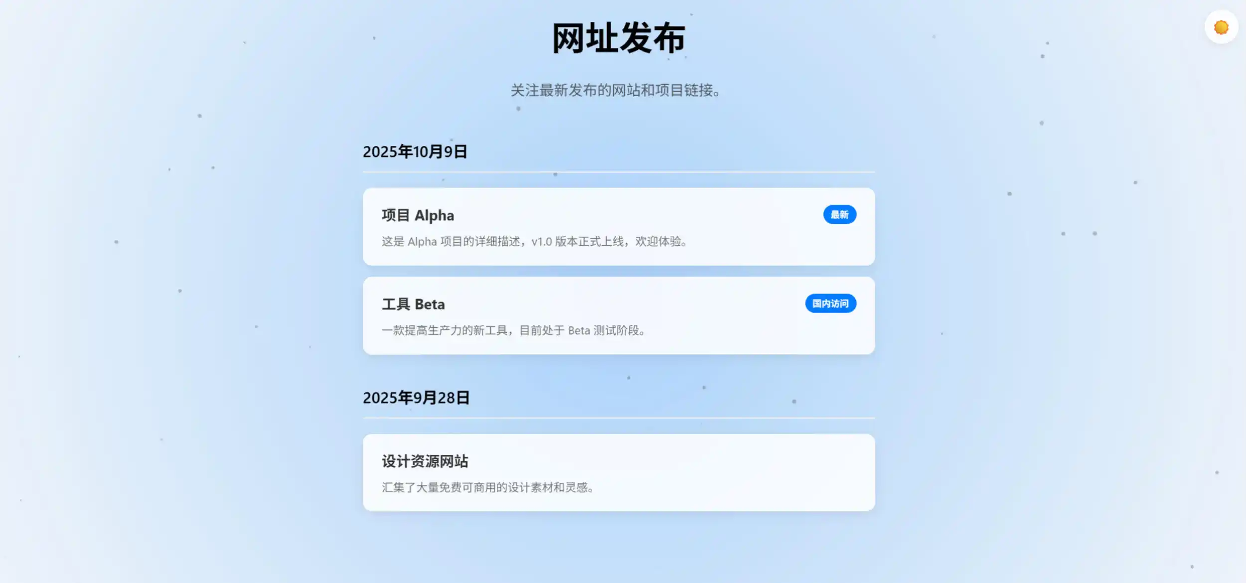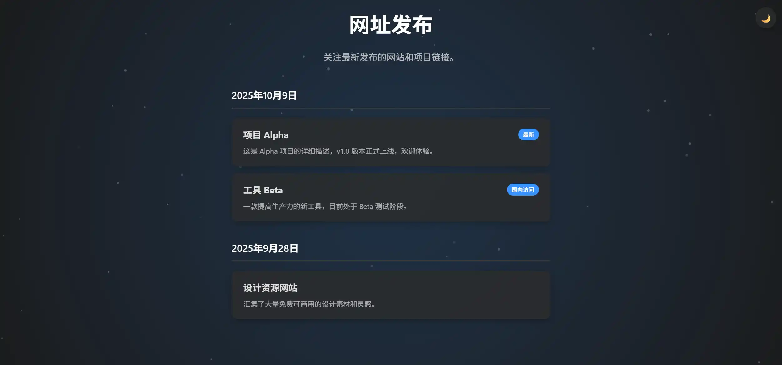 - 一款由html开发的网址发布单页源码,适用于中转页,发布页,中间页等。支持深色模式和浅色模式的切换,动态粒子背景,“极光”特效背景,有悬浮卡片特效,卡片发光特效。自适应屏幕尺寸,不用担心适配问题,简洁大方。