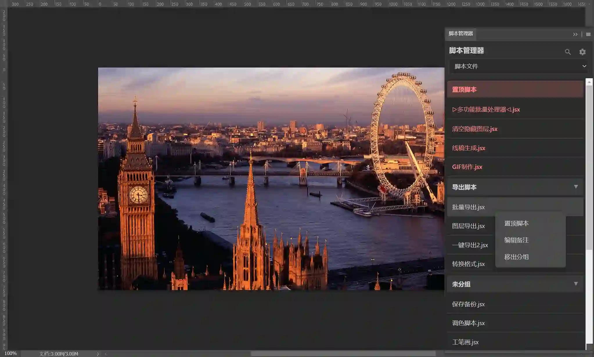 - PS脚本管理器插件的主要功能就是管理 PS脚本,没有使用管理插件时,使用脚本步骤非常繁琐,需要点击多个菜单才可以,而且有时需要点击多次,使用ps脚本管理器插件后,直接在面板中使用,省去繁琐步骤,达到一键使用的目的。