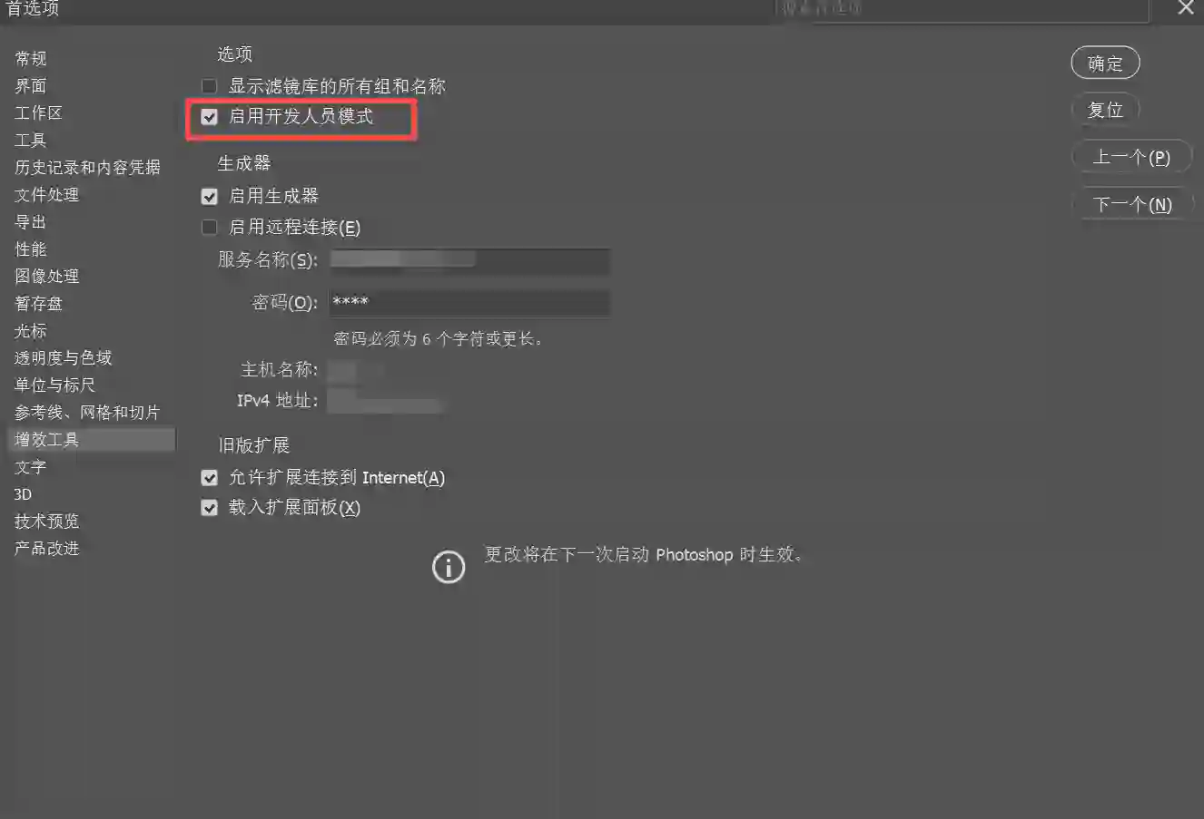打开 PS,Ctrl+K,然后选择增效工具,将启用开发人员模式勾选,确定后重启 ps 即可。